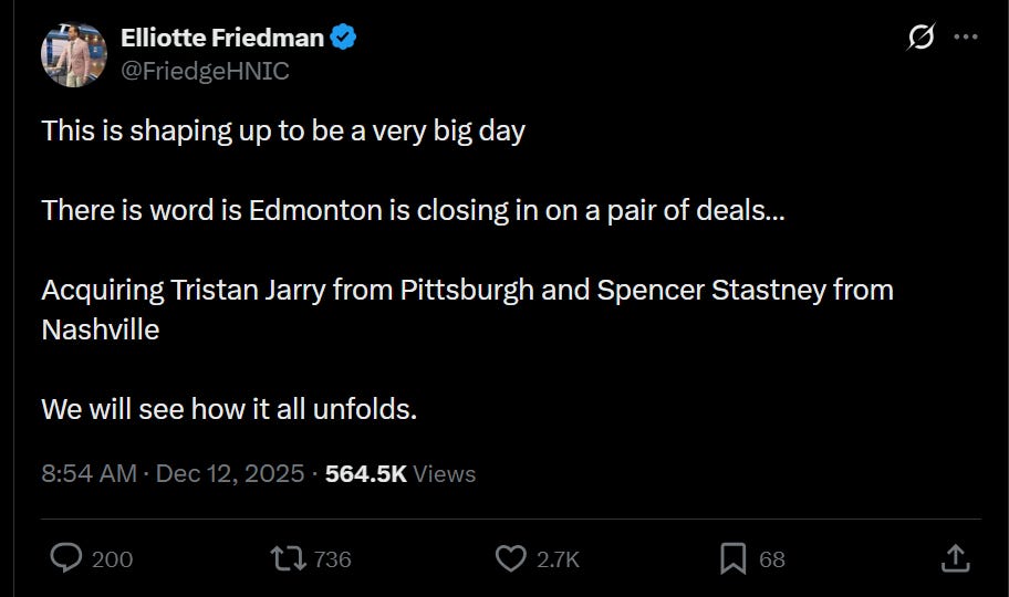 The Nashville Predators announced on Friday, December 12 that defenseman Spencer Stastney has been traded to the Edmonton Oilers in exchange for a 3rd round pick in the 2027 NHL draft. The news was first broke by NHL Insider Elliotte Friedman as he teased a couple moves taking shape for the Oilers. Pierre LeBrun soon confirmed the return of a 3rd round pick in 2027.